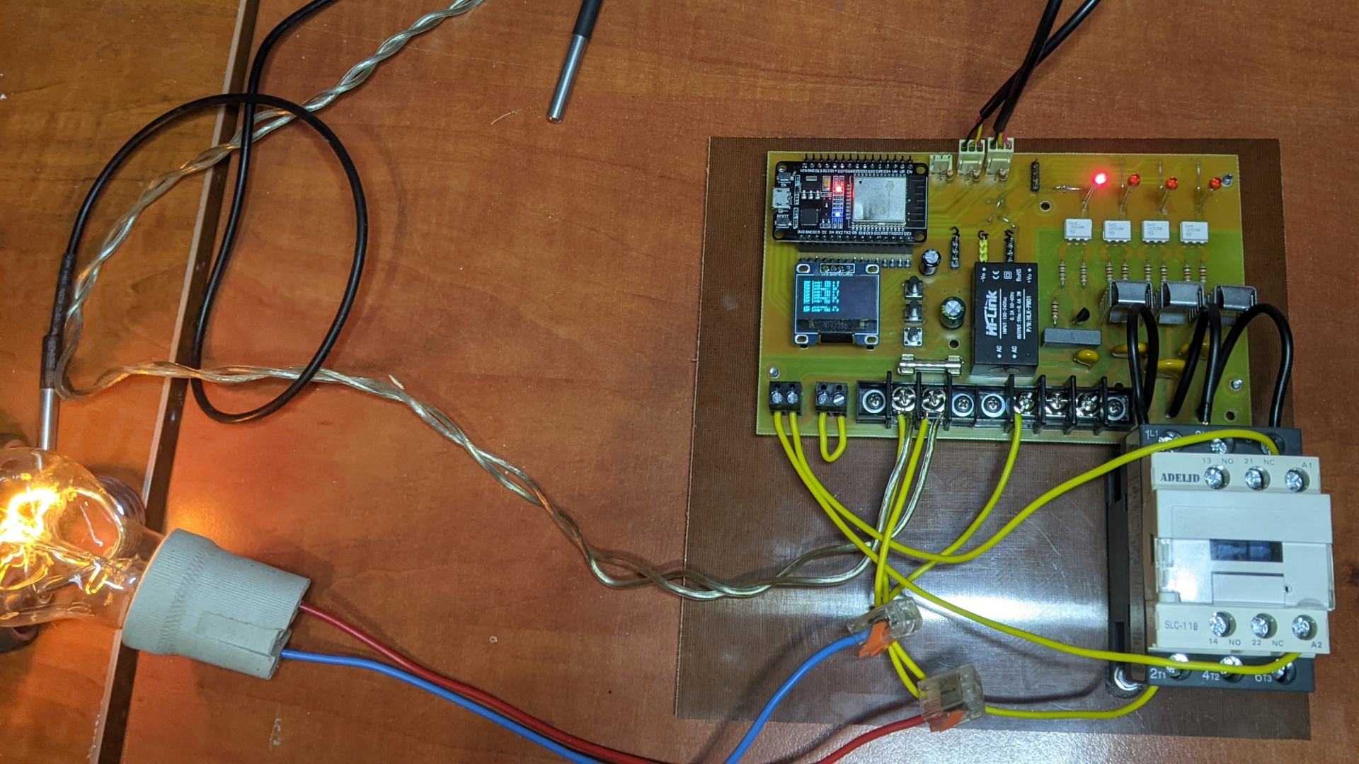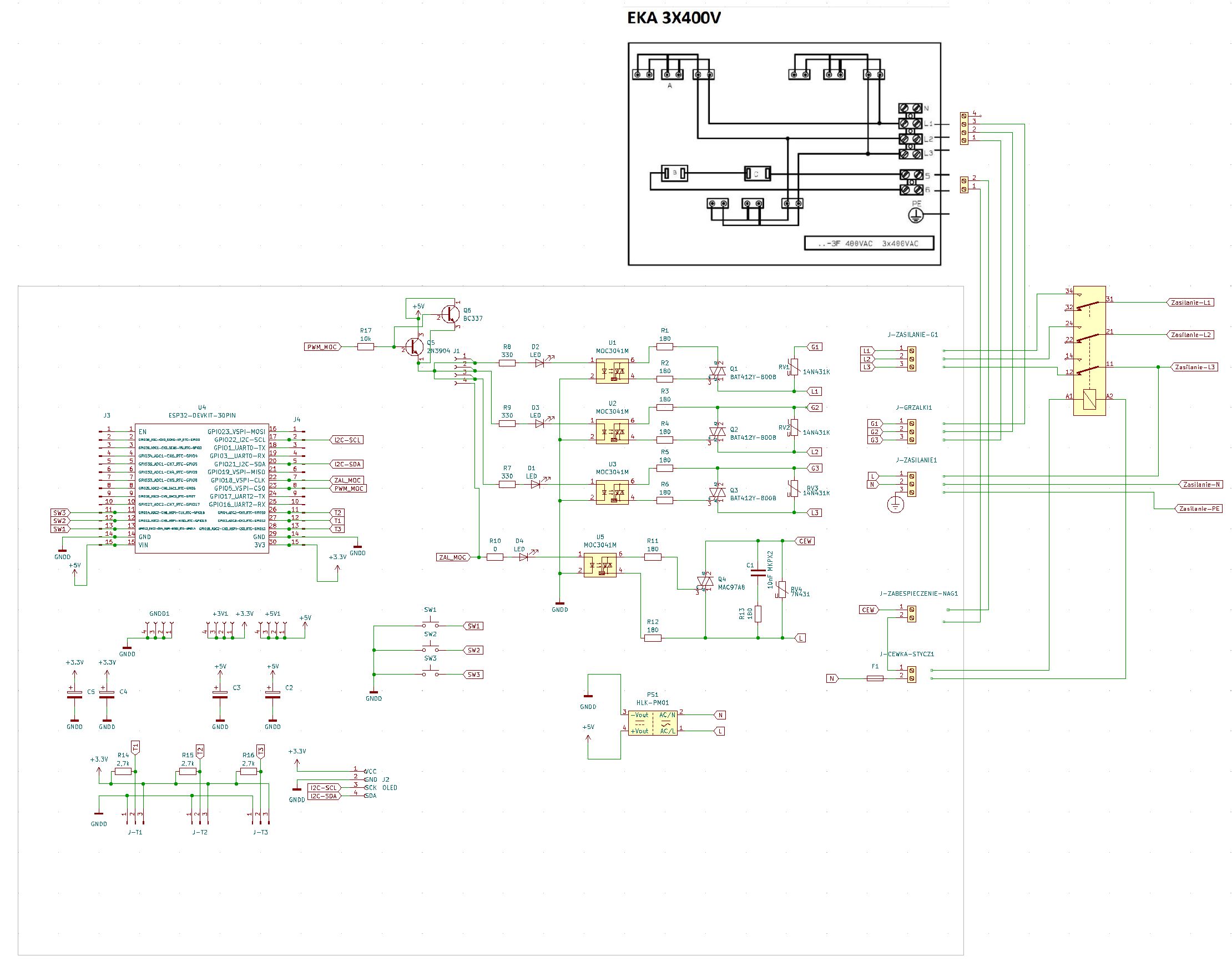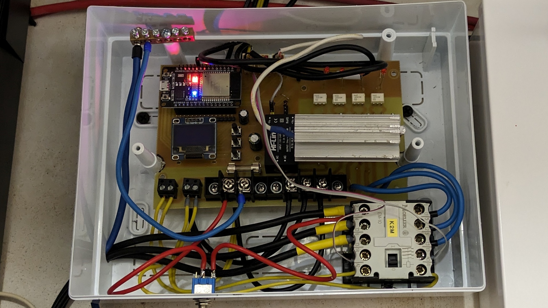Trzeba jeszcze ją jakoś sterować. Nagrzewnica ma zainstalowane 3 grzałki o łącznej mocy 6kW, zasilana z 3x400V. Czyli grzałki 400V zasilane z trzech faz. Okład oparty na trikach sterownych metodą PWM. Regulator PID zbindowany programowo na bazie mikrokontrolera ESP32 prostym mały wyświetlaczem OLED 0,96 ” i trzema przyciskami. komunikacja z systemem za pomocą WIFi. Początkowo napisałem swój własny kod i komunikowałem się z Home Assistant za pomocą protokołu MQTT. Później jednak przeszedłem na moim zdaniem prostsze rozwiązanie a mianowicie skorzystałem z mechanizmów ESPOHome. W tej wersji już nie wykorzystuje wyświetlacza i przycisków. Zresztą sterownik umieściłem jak najbliżej nagrzewnicy czyli pod sufitem i w zamkniętej obudowie co bardzo utrudnia bezpośredni dostęp do niego.